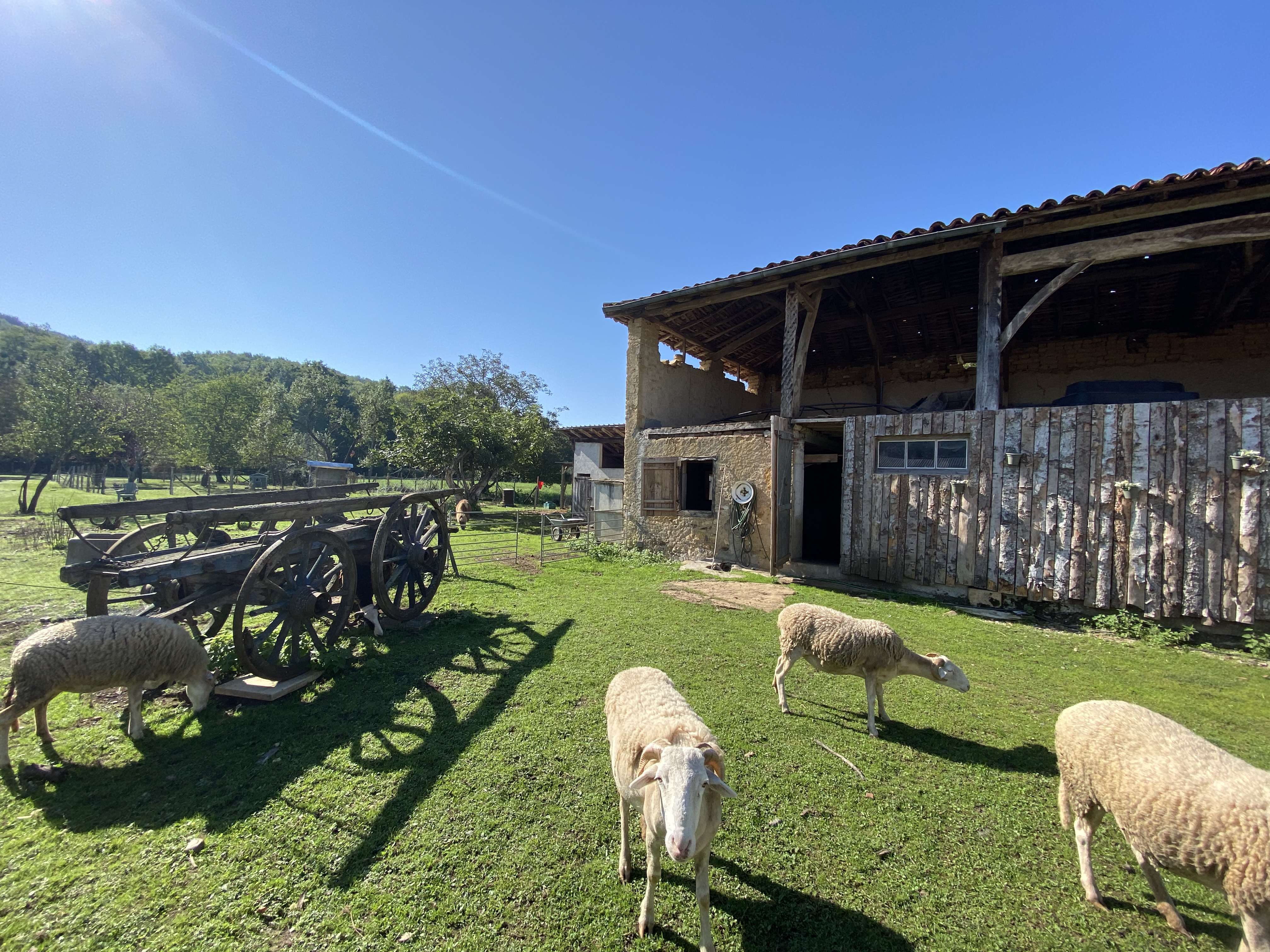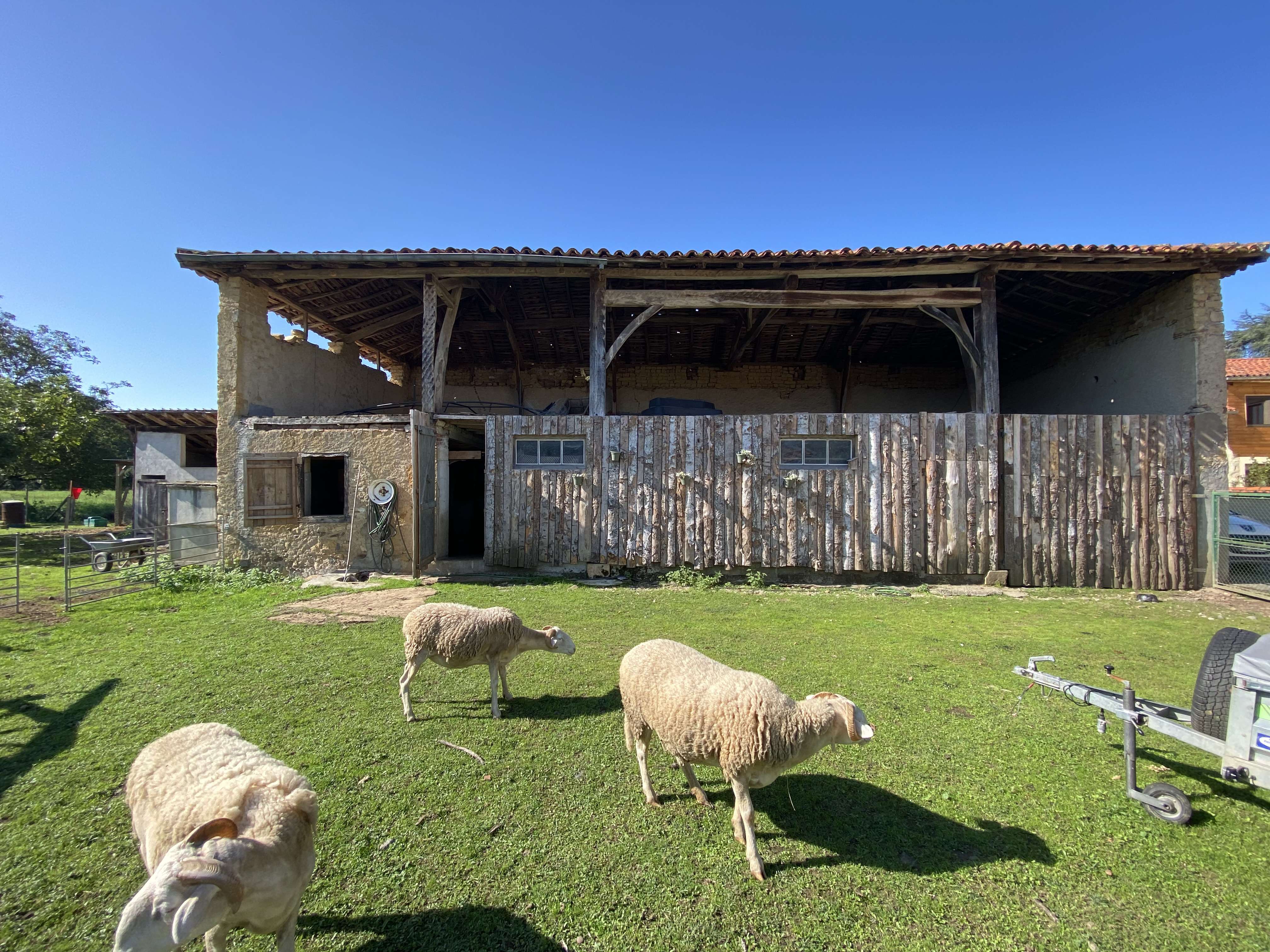 En face de la maison, nous trouvons un abri voiture de 42 m² ainsi qu'une grange de 110 m².
